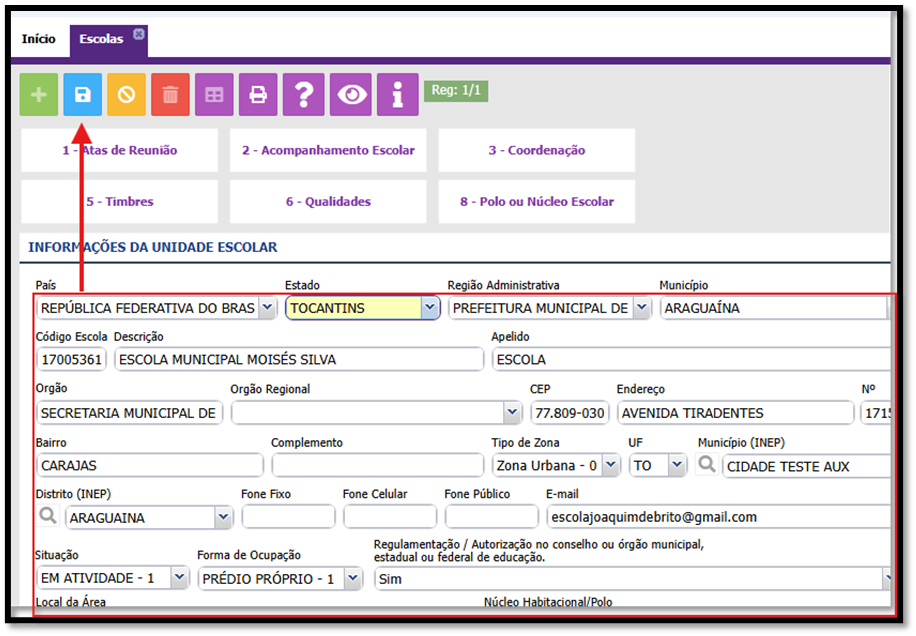 2. Se seu usuário tiver acesso apenas a uma escola, ao abrir a tela de escola o sistema já irá buscar os dados de sua escola.