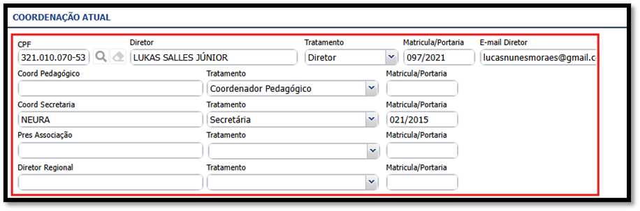 3. Nesta tela, é possível atualizar o nome do diretor, do secretário e do coordenador pedagógico, para que essas informações sejam refletidas em alguns relatórios. Essas informações serão informadas em COORDENAÇÃO ATUAL.