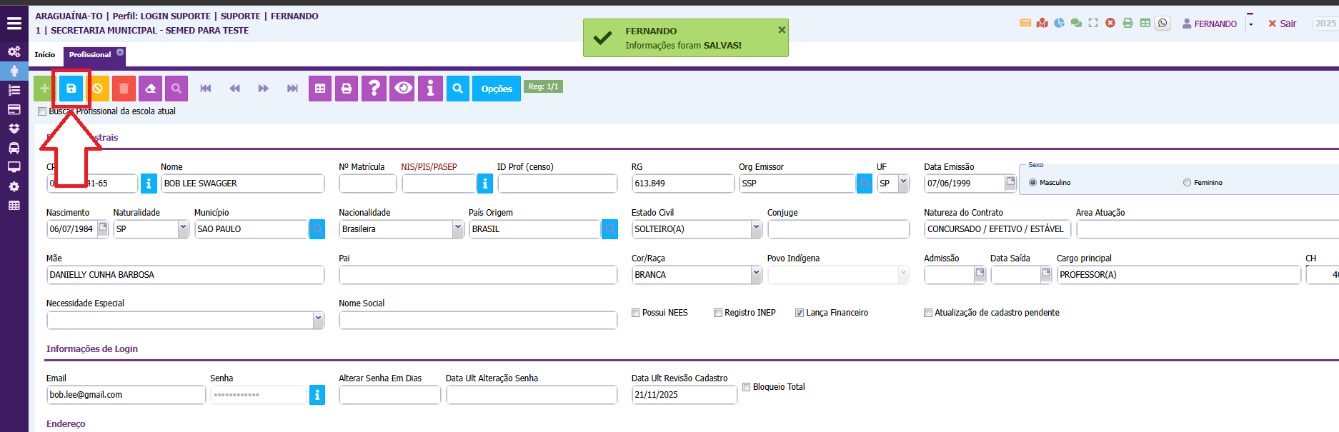 5. Após ter preenchido os dados do profissional, clique em no botão azul salvar , assim o cadastro será exibido com sucesso;