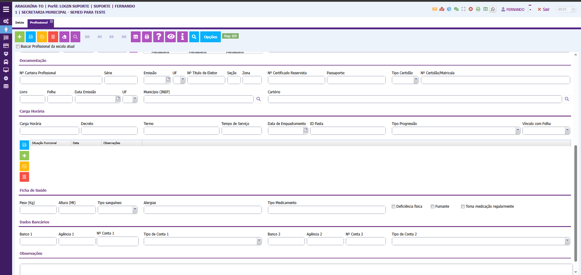 Os campos de DOCUMENTAÇÃO, CARGA HORÁRIO, FICHA DE SAÚDE não são obrigatórios o preenchimento e poderão ser informados em outro momento.