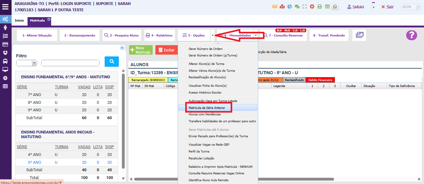 3. Clique no botão OPÇÕES, depois selecione a opção MATRÍCULA DA SÉRIE ANTERIOR.