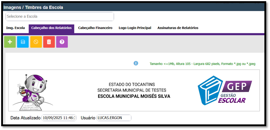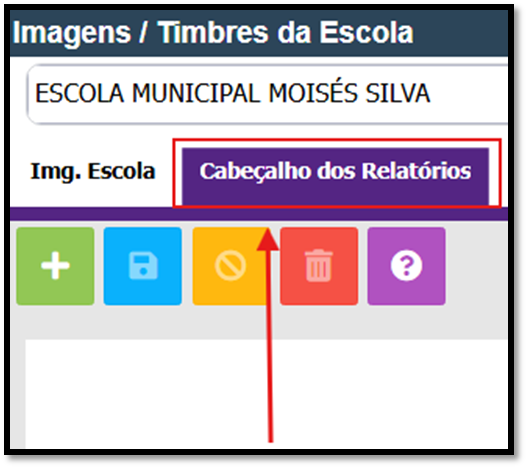 3 - O sistema exibirá a tela onde você deverá incluir o timbre da instituição. Selecione a opção CABEÇALHO DOS RELATÓRIOS!