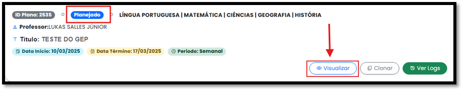 4 - Ao confirmar, selecione o plano que está com o status 'Planejado' e clique em visualizar, para que possamos defini-lo como 'Não planejado.