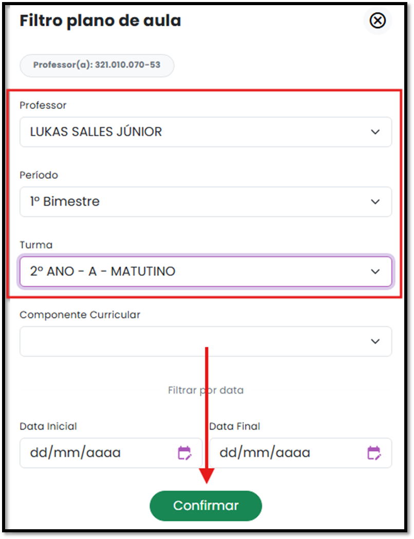 2 - Seleciona a opção de filtrar, informe os dados do professor e depois clique em confirmar.