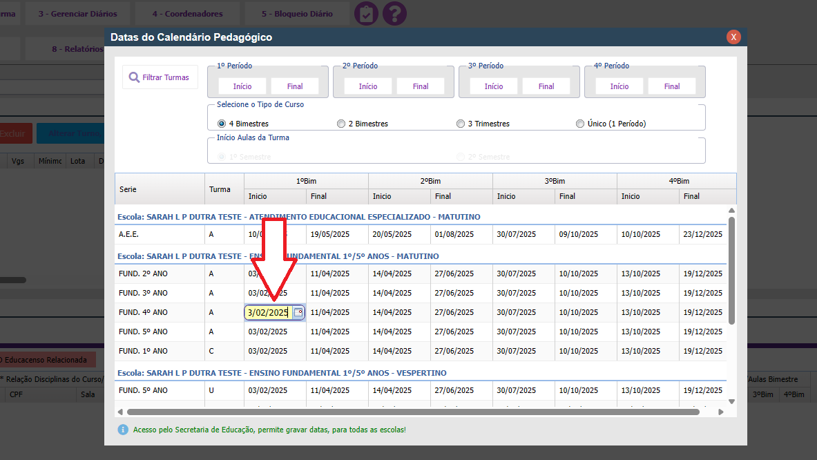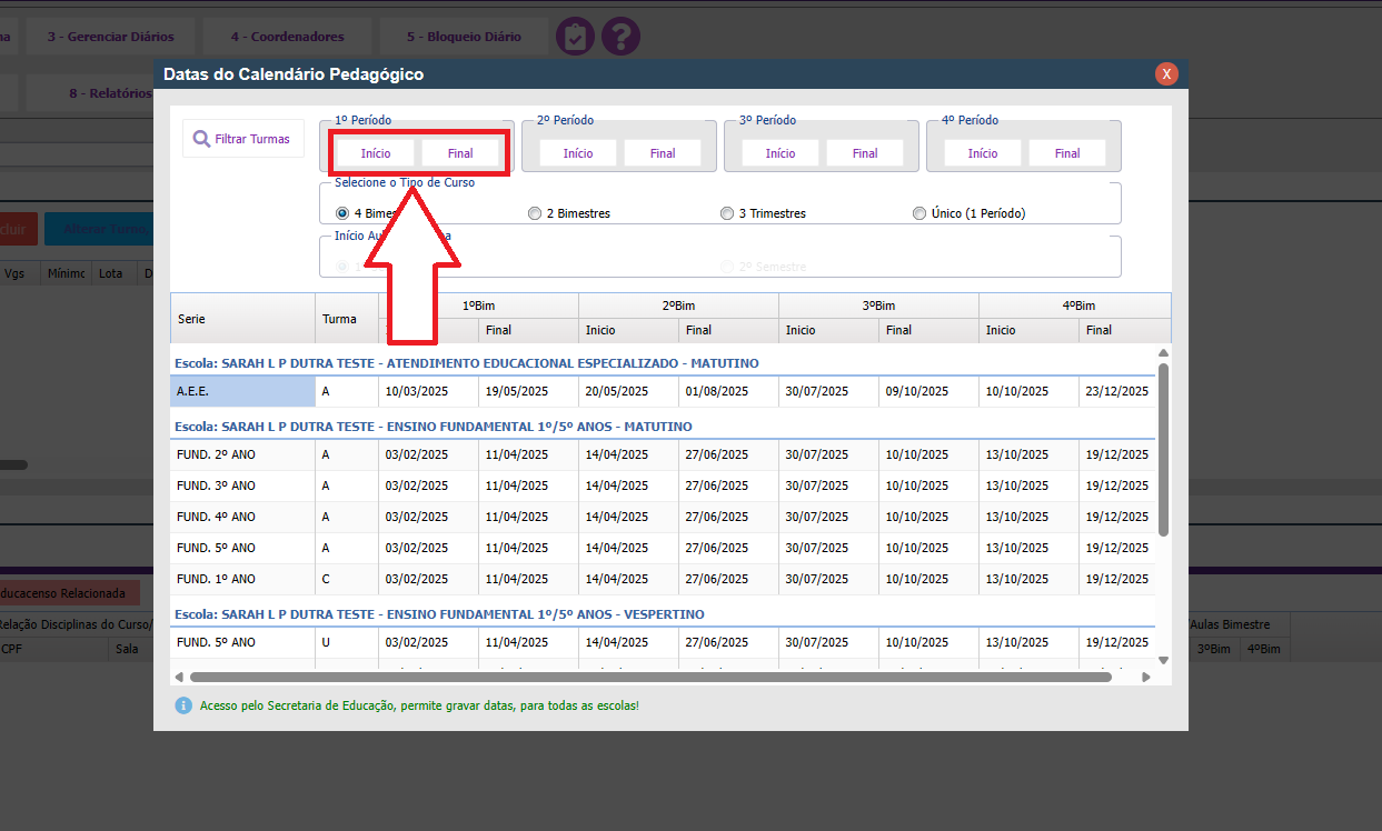 Definir datas do calendário pedagógico (4 bimestres)📅 - GEP WEB