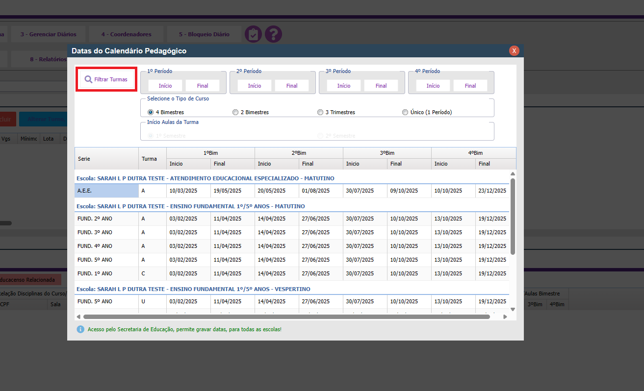 3. Se necessário, você pode filtrar a(s) turma(s). Dessa forma, facilita a localização de uma turma ou diário em específico que não esteja com a data correta ou esteja sem as datas bimestrais informadas.