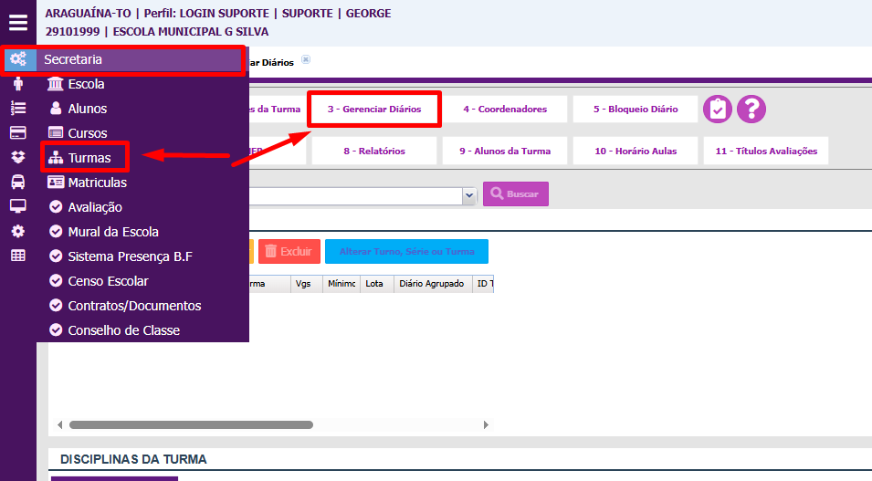1. Selecione Menu Secretaria > Turmas > Clica no Botão 3 GERENCIAR DIÁRIOS;