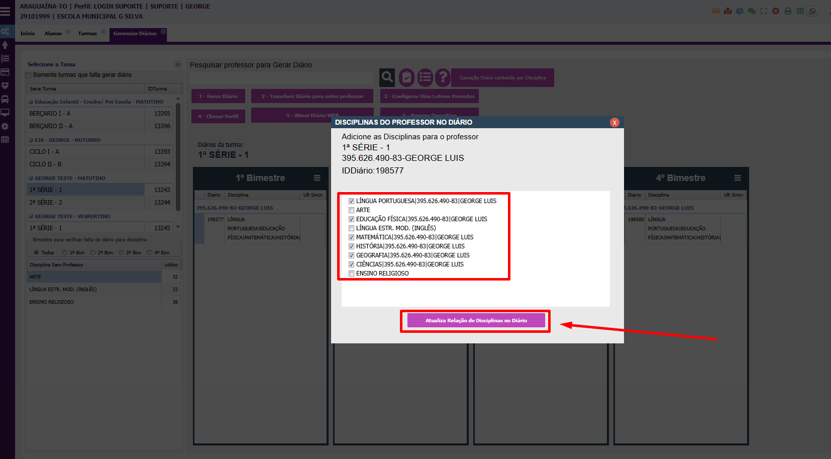 2. Agora basta clicar em "Atualizar Relação de Disciplinas no Diário";
