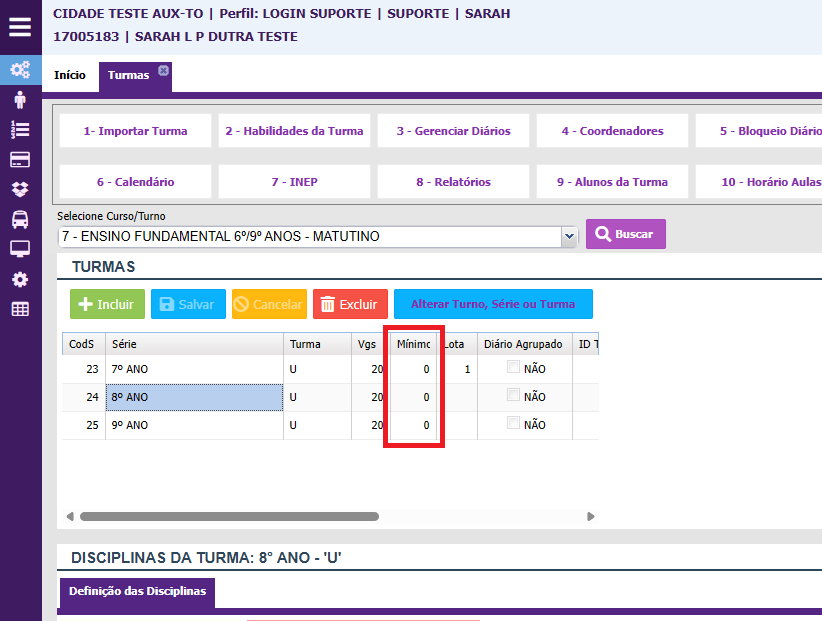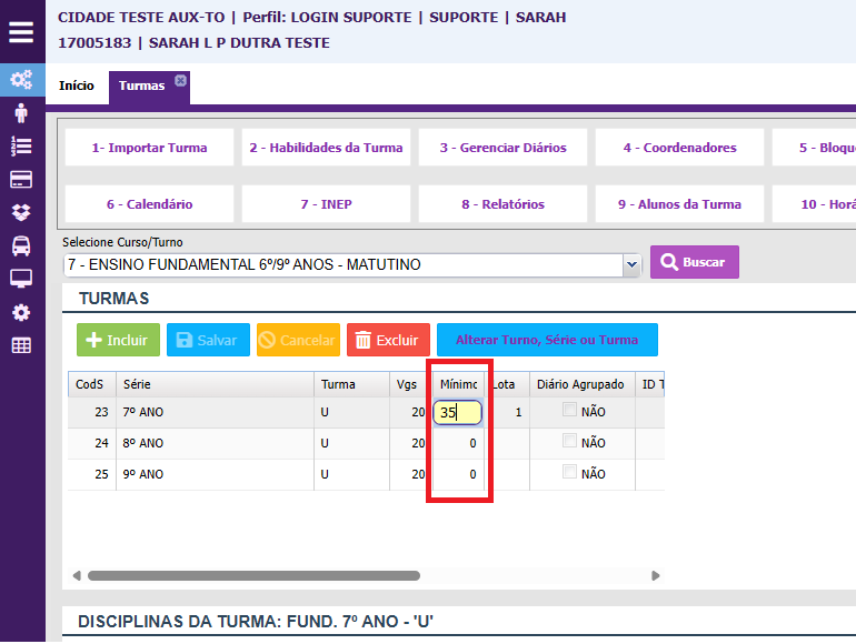 3. Na coluna MÍNIMO, clique no número referente à turma, coloque 0 e clique na turma debaixo ou na de cima para SALVAR.
