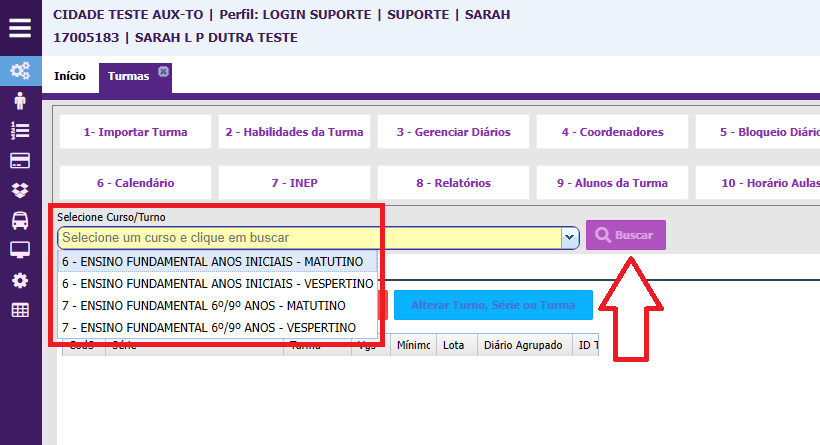 2. Selecione e busque o curso/turno referente a turma que apareceu a mensagem.