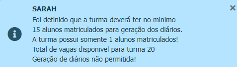Ao tentar gerar o(s) diário(s) de uma turma apareceu a mensagem abaixo? Neste artigo, você verá como solucionar essa situação para que você possa gerar o(s) diário(s).