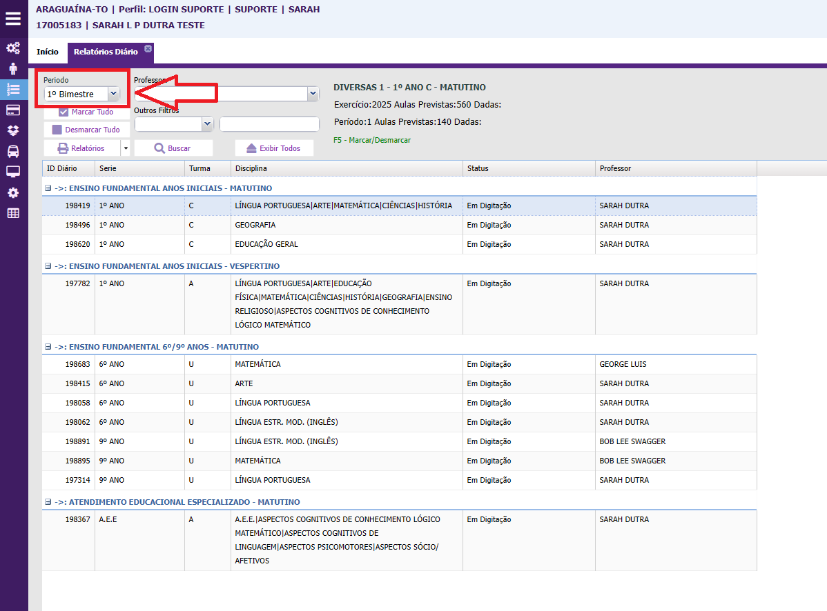 2. Clique em período e selecione o bimestre.