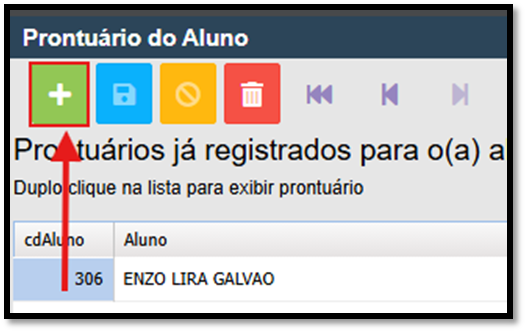 3º. Com a ficha do aluno aberta, clique na opção 3 - Prontuário, conforme mostrada na imagem;