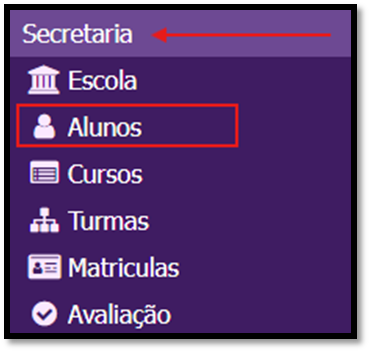 1º. Com o sistema GEP aberto, clique no menu Secretaria, e clique no módulo de Alunos;