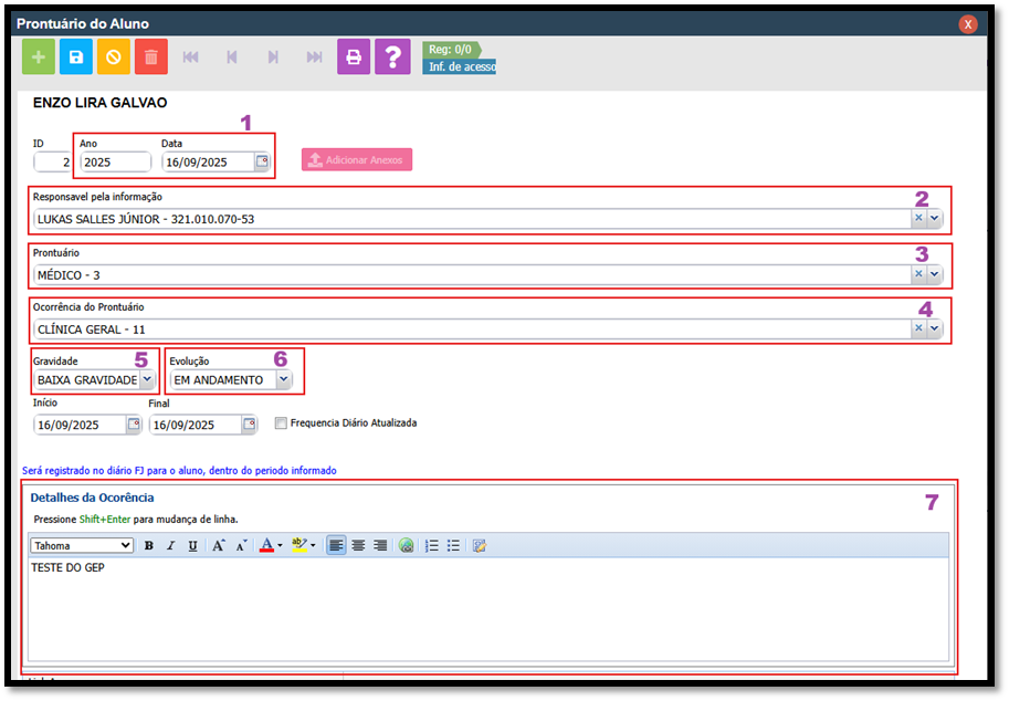 O preenchimento do módulo de Prontuário é feito quando há alguma eventualidade e/ou incidente com o aluno, seja ela comportamental, contributiva, relacionada ao desenvolvimento, médico ou pedagógica.
