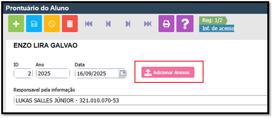 Após salvar será possível incluir um anexo com informações sobre o prontuário do aluno;