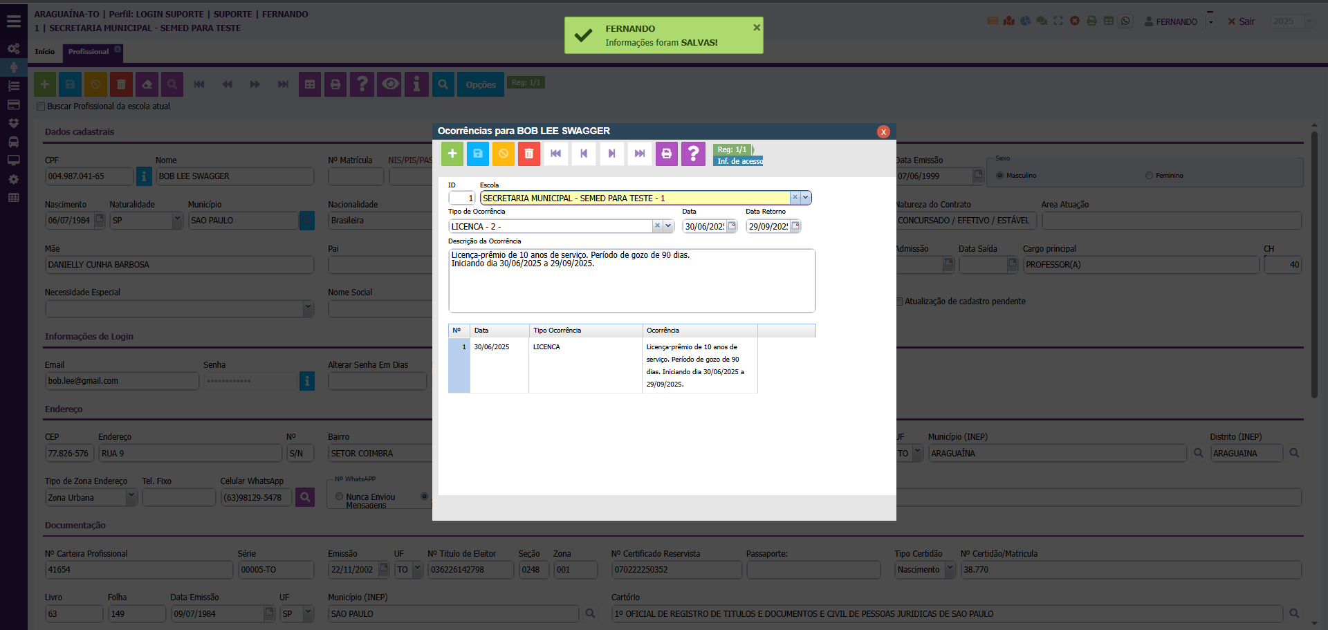O preenchimento do módulo de Ocorrências é feito quando há alguma eventualidade e/ou incidente com o profissional, seja férias, licença, participação em curso, faltas, dentre outras.