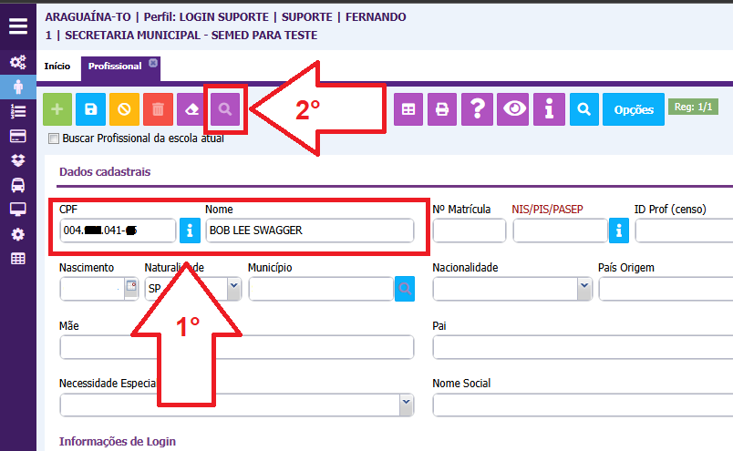 1. Antes de iniciar precisamos buscar o profissional para definir, preencha o campo CPF ou campo NOME , após preencher clique no botão BUSCAR . 2. Após localizar o profissional, cliquemos no botão ; 3. Selecione a opção 16-PERFIL DE ACESSO e clica no ...