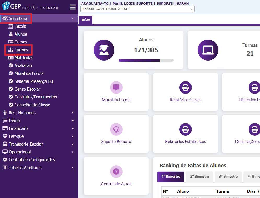 1. Menu secretaria, módulo de turmas.