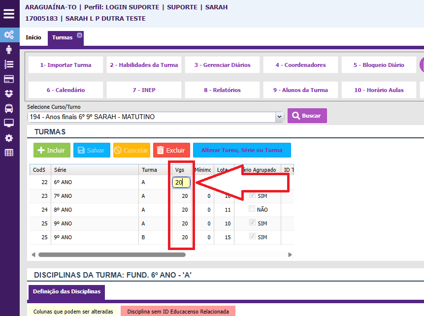 3. Na coluna VGS (Vagas), clique na que corresponde à turma que você deseja alterar as vagas.