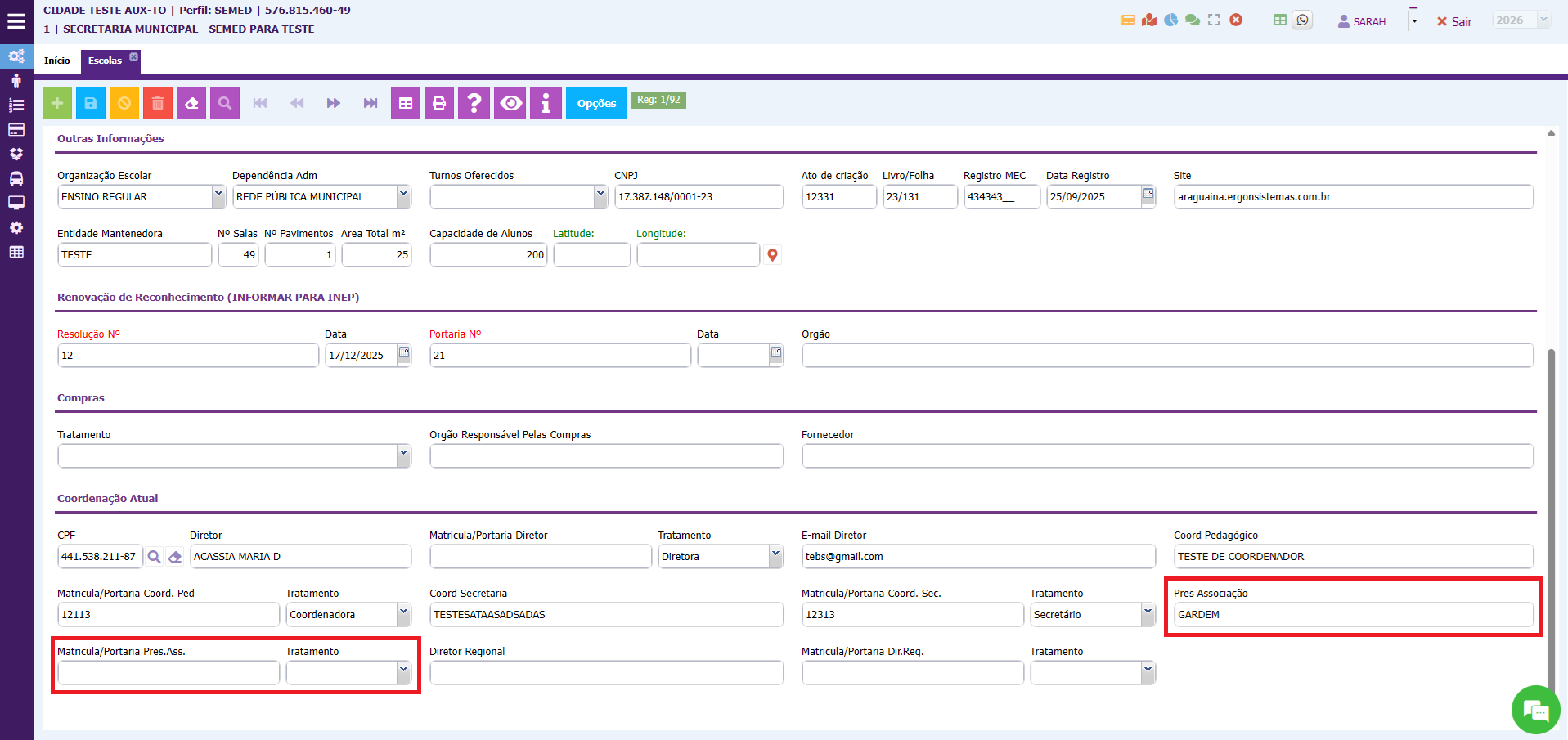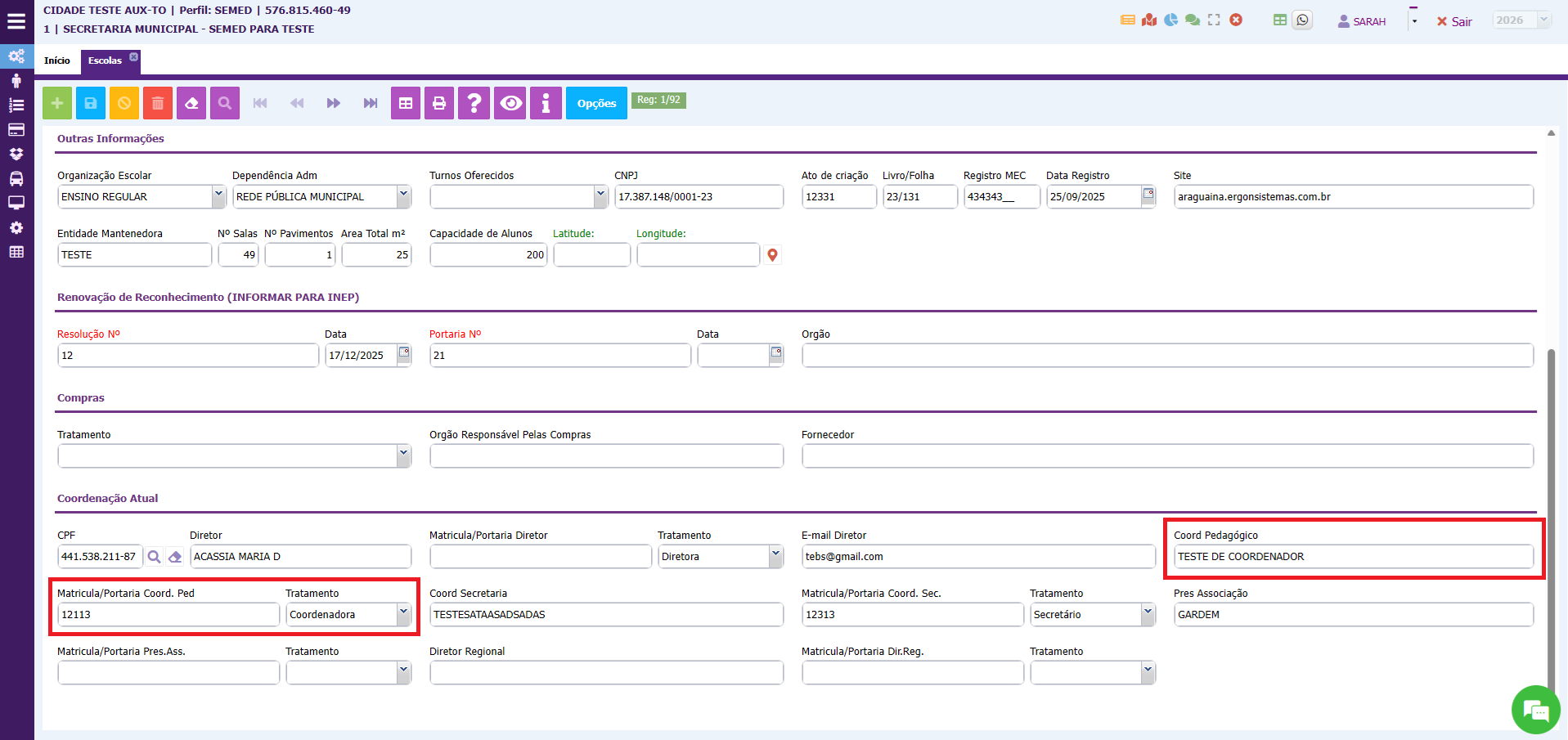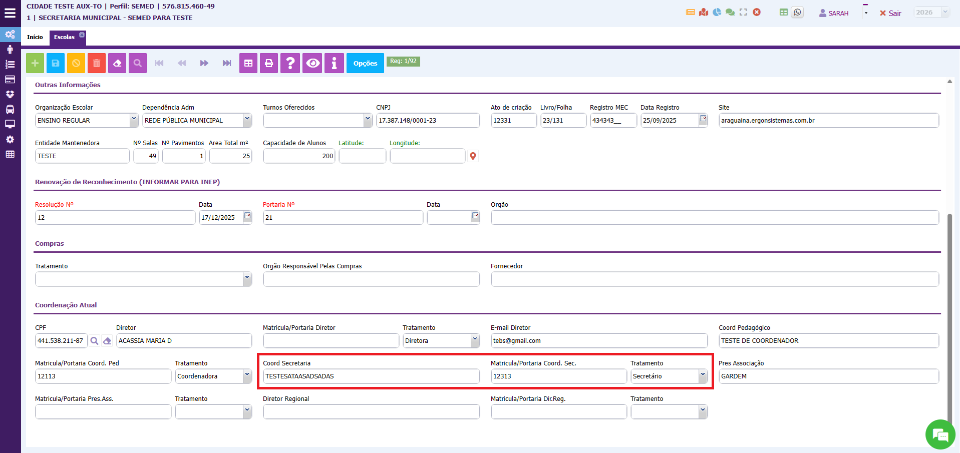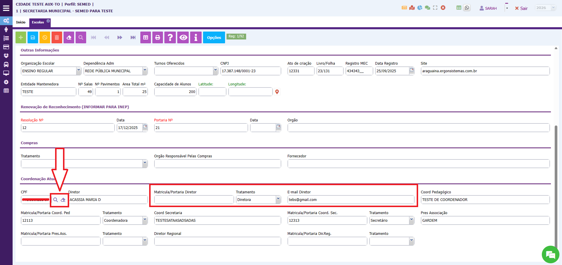 3. Nesta tela também é possível atualizar o nome do diretor, do secretário e do coordenador pedagógico, para que essas informações sejam geradas em alguns relatórios. Essas informações serão informadas em COORDENAÇÃO ATUAL.
