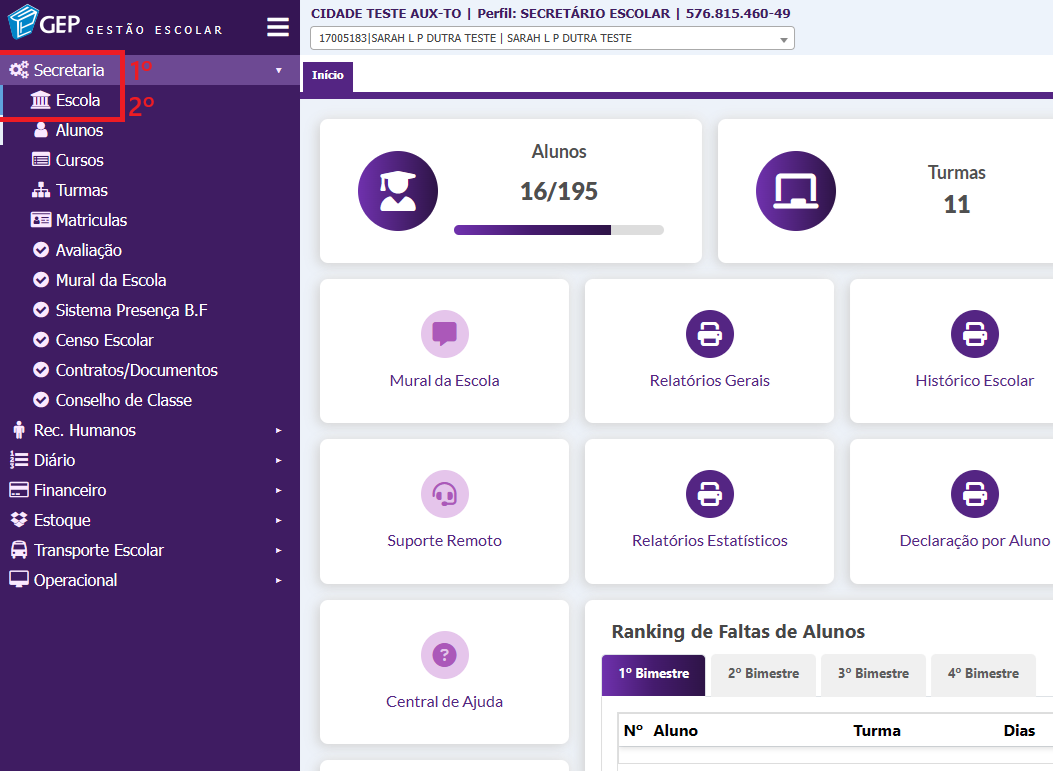 1. Clique menu secretaria e selecione o modulo de Escola.