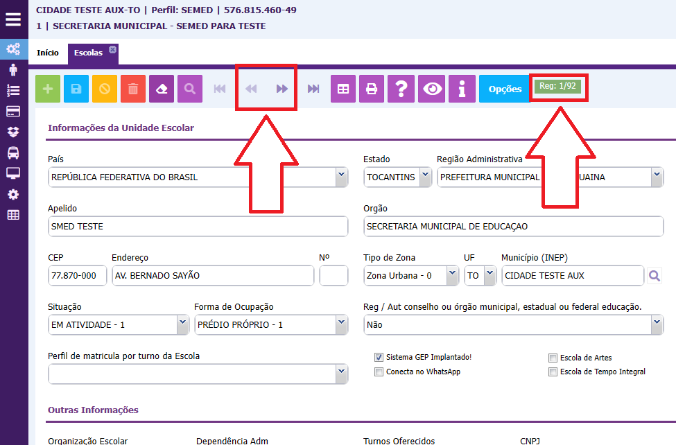Se seu usuário tiver acesso apenas a uma escola, ao abrir a tela de escola o sistema já irá buscar os dados de sua escola. Caso você tenha acesso a mais de uma escola, você consegue obeservar no campo verde. Utilize as setas destacadas na imagem abaixo para navegar pelo cadastro das escolas que você tem acesso.