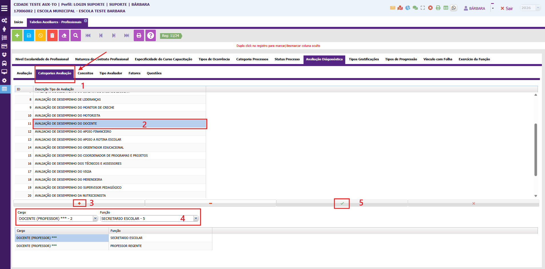 Na aba (Categorias Avaliação) será o local responsável por vincular os perfis de acesso, permitindo aplicar a avaliação para o perfil adequado;