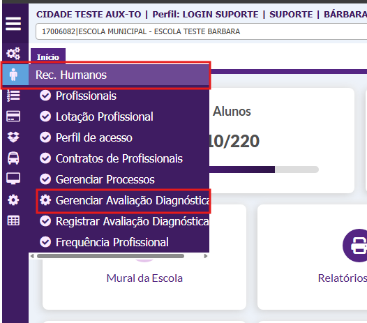 Gerenciar Avaliação DiagnósticaAcesse o menu (Rec. Humanos) e acesse o módulo (Gerenciar Avaliação Diagnóstica) para incluirmos os profissionais que serão avaliados e os avaliadores;