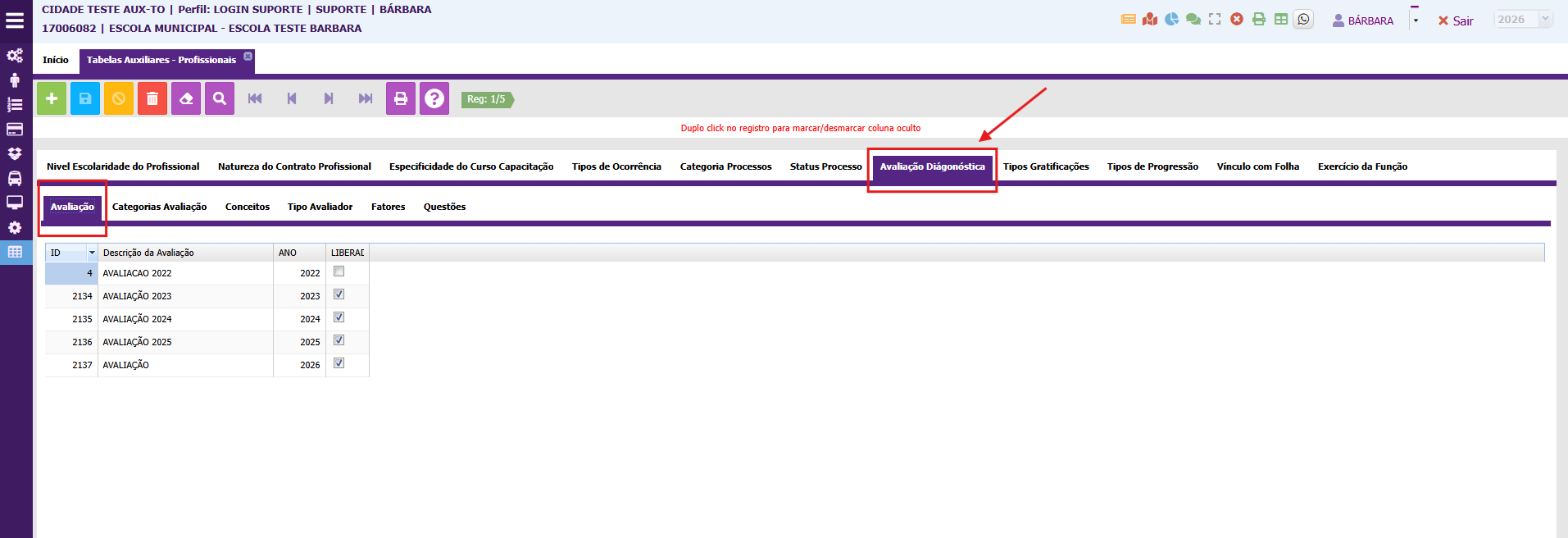 Em (Profissionais) clique na aba (Avaliação Diagnóstica); e depois acesse a aba (Avaliação), que é o local onde será informado o nome da avaliação e o ano;