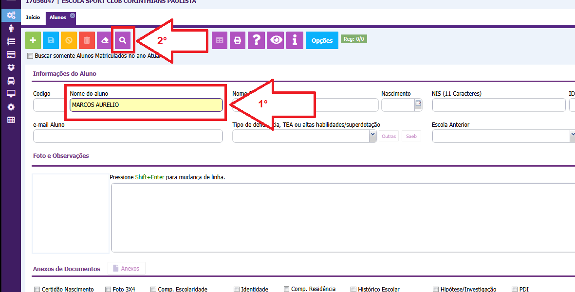 2- Com o modulo de ALUNOS aberto iremos realizar a busca do cadastro;