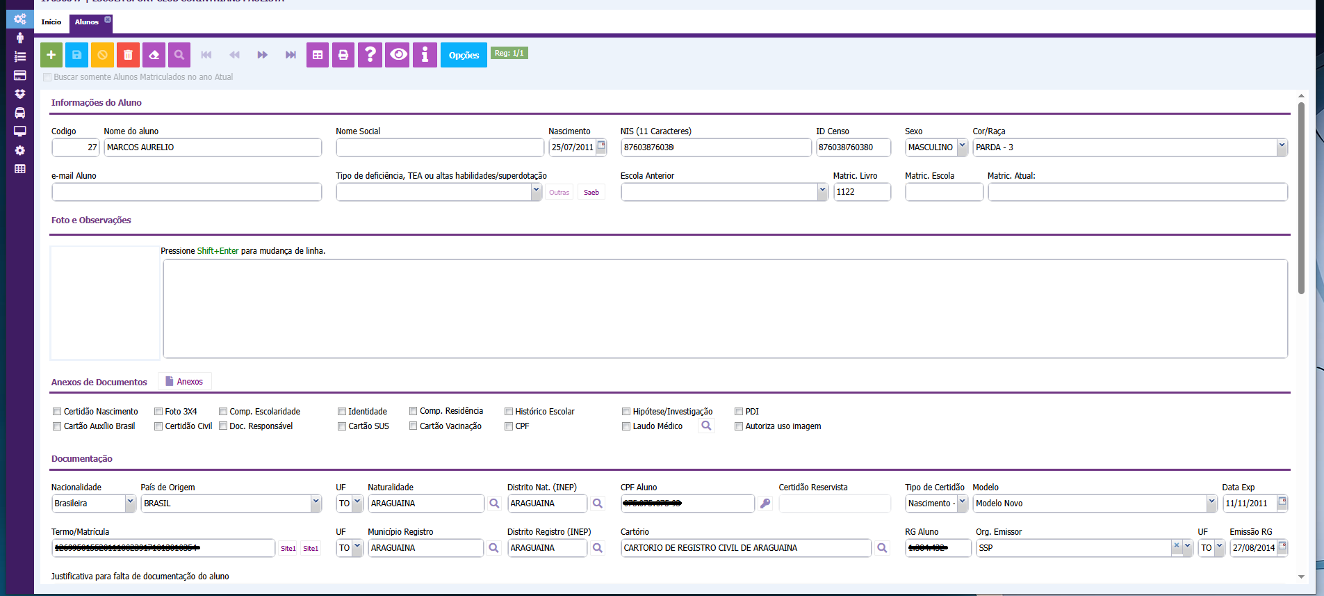 3- Caso esteja tudo correto na busca o sistema irá retornar os cadastro do aluno com os campos preenchidos.