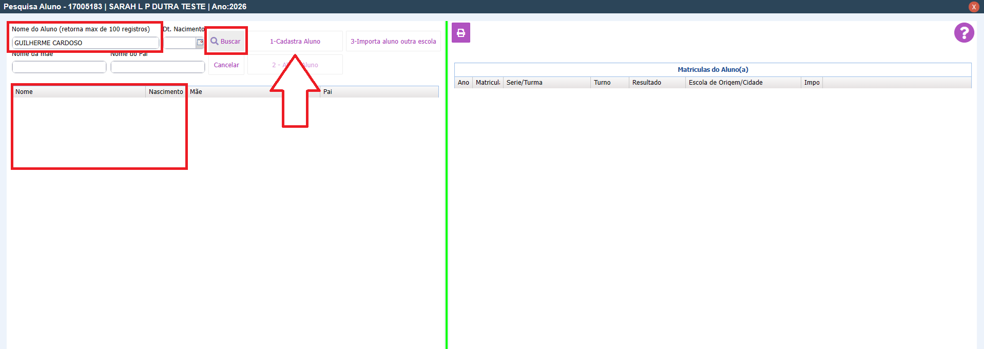 Você também pode preencher essas informações (data de nascimento, nome da mãe, nome do pai) e buscar. Assim, o filtro será maior e terá mais chance de encontrar o aluno exato.