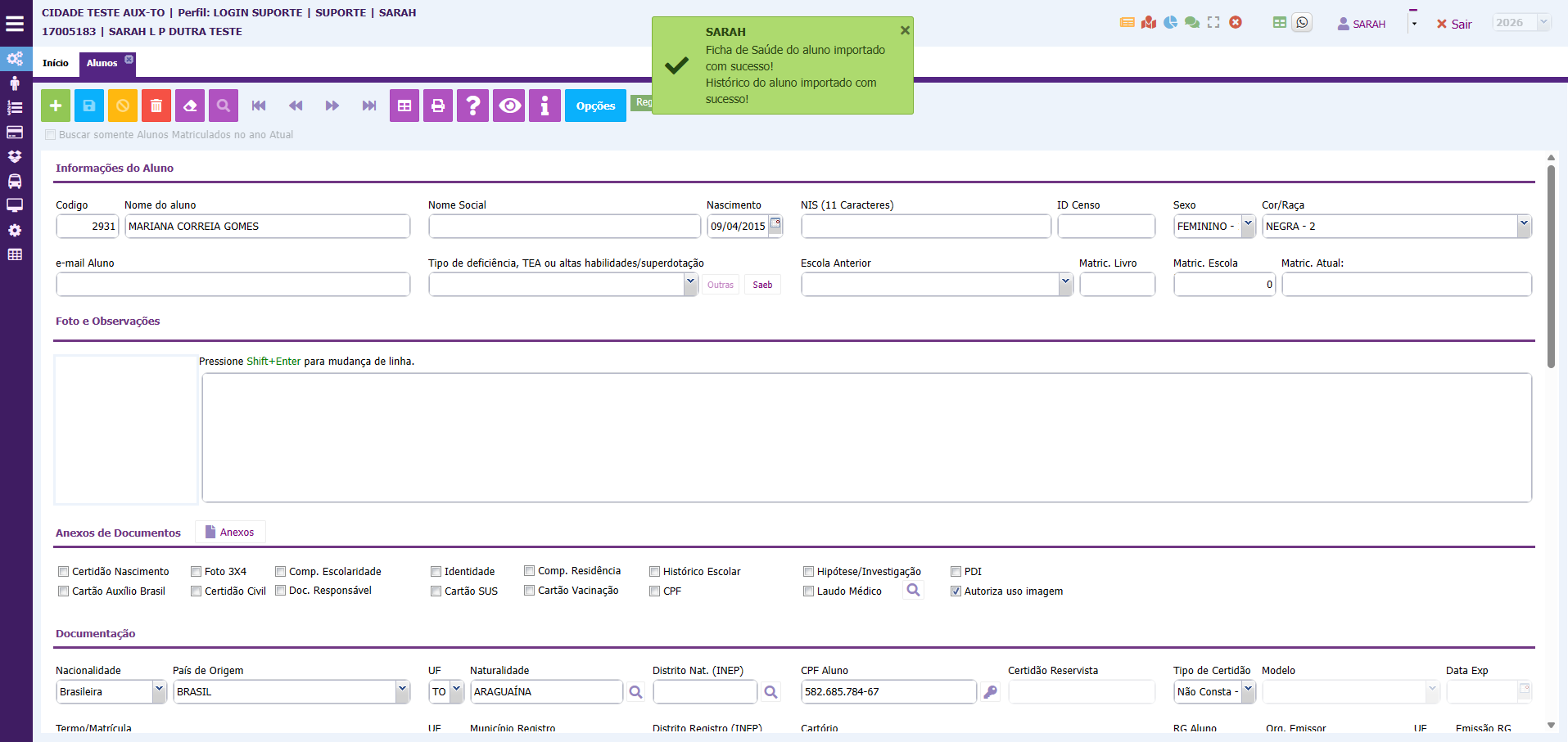 6. Cadastro importado com sucesso! Note que aparecerá uma mensagem no quadro verde, indicando que outras informações contidas no cadastro dele também foram importadas junto.