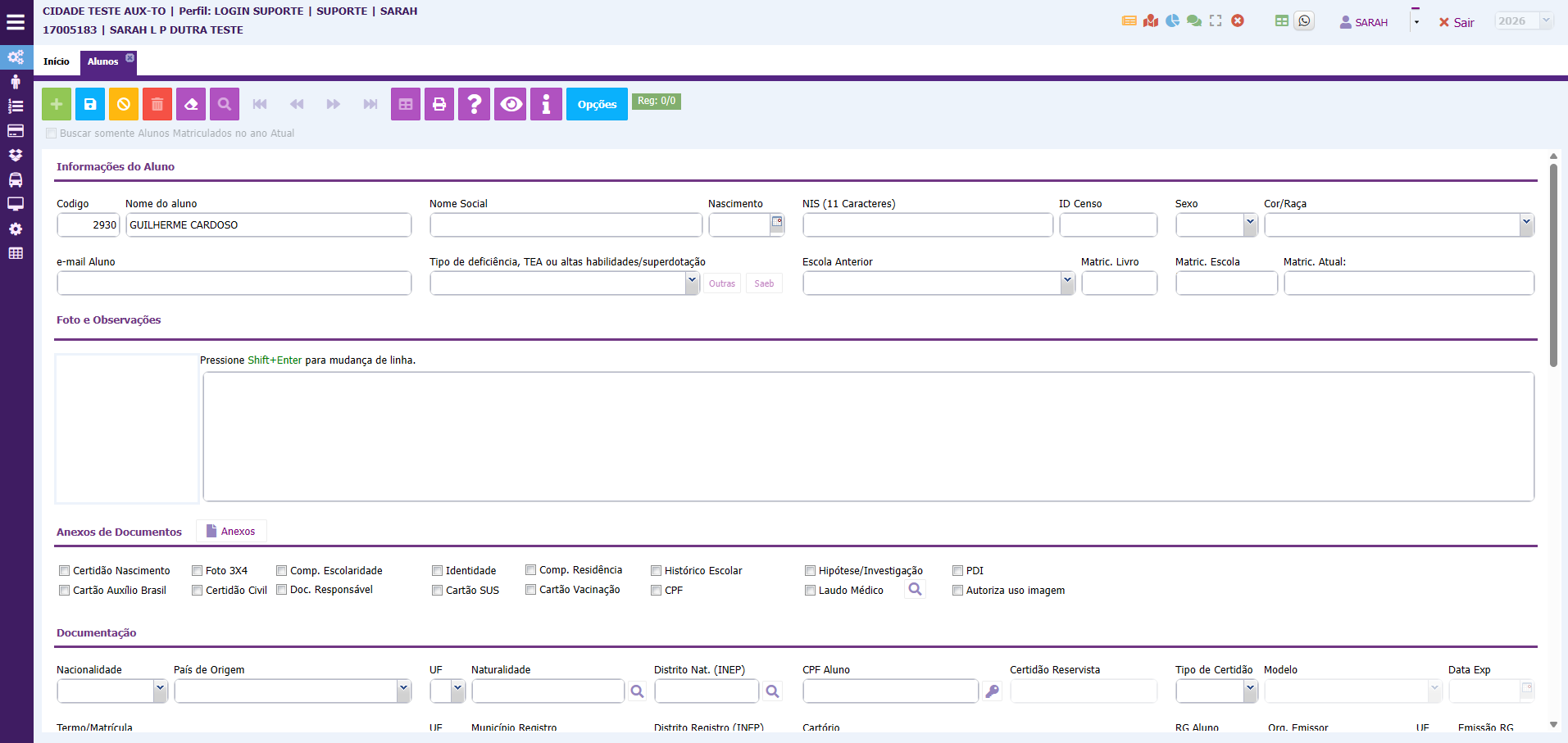 3. Após clicar no botão para cadastrar um novo aluno, o sistema voltará para a tela da ficha de cadastro de alunos. O nome virá preenchido automaticamente, você vai precisar preencher todos os outros dados necessários. Ao finalizar, clique no botão