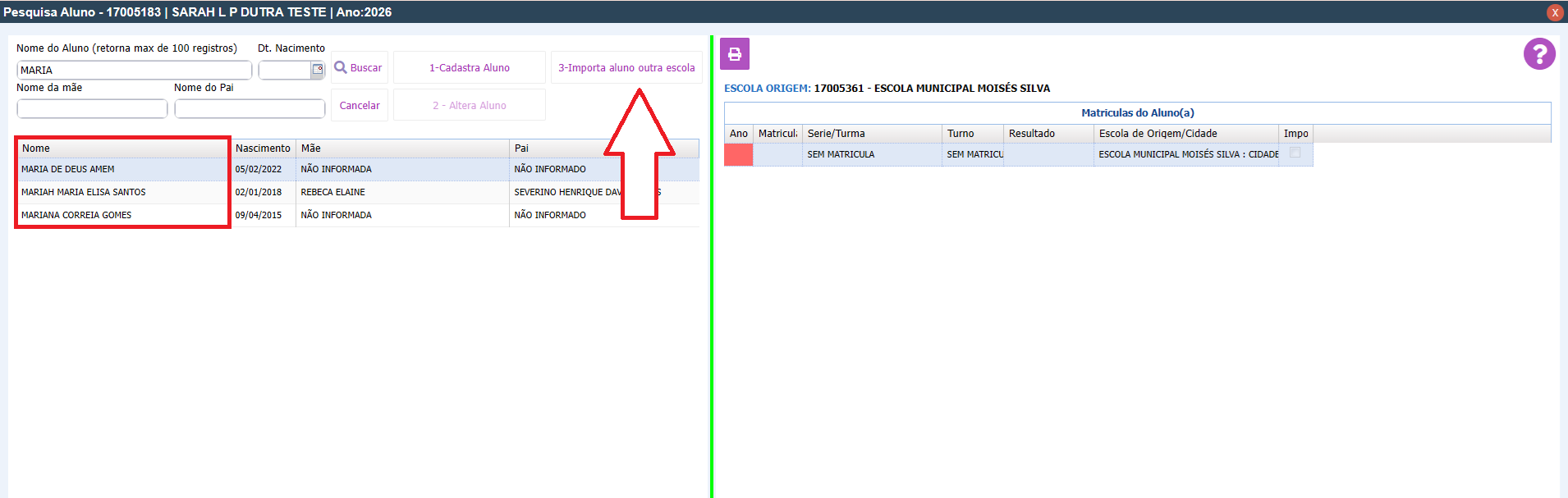 4. Após preencher o nome completo e notar que tem uma aluna(o) já cadastrado, observe a data de nascimento e o nome dos pais. Se for compatível, selecione o aluno desejado e clique em IMPORTAR ALUNO OUTRA ESCOLA.