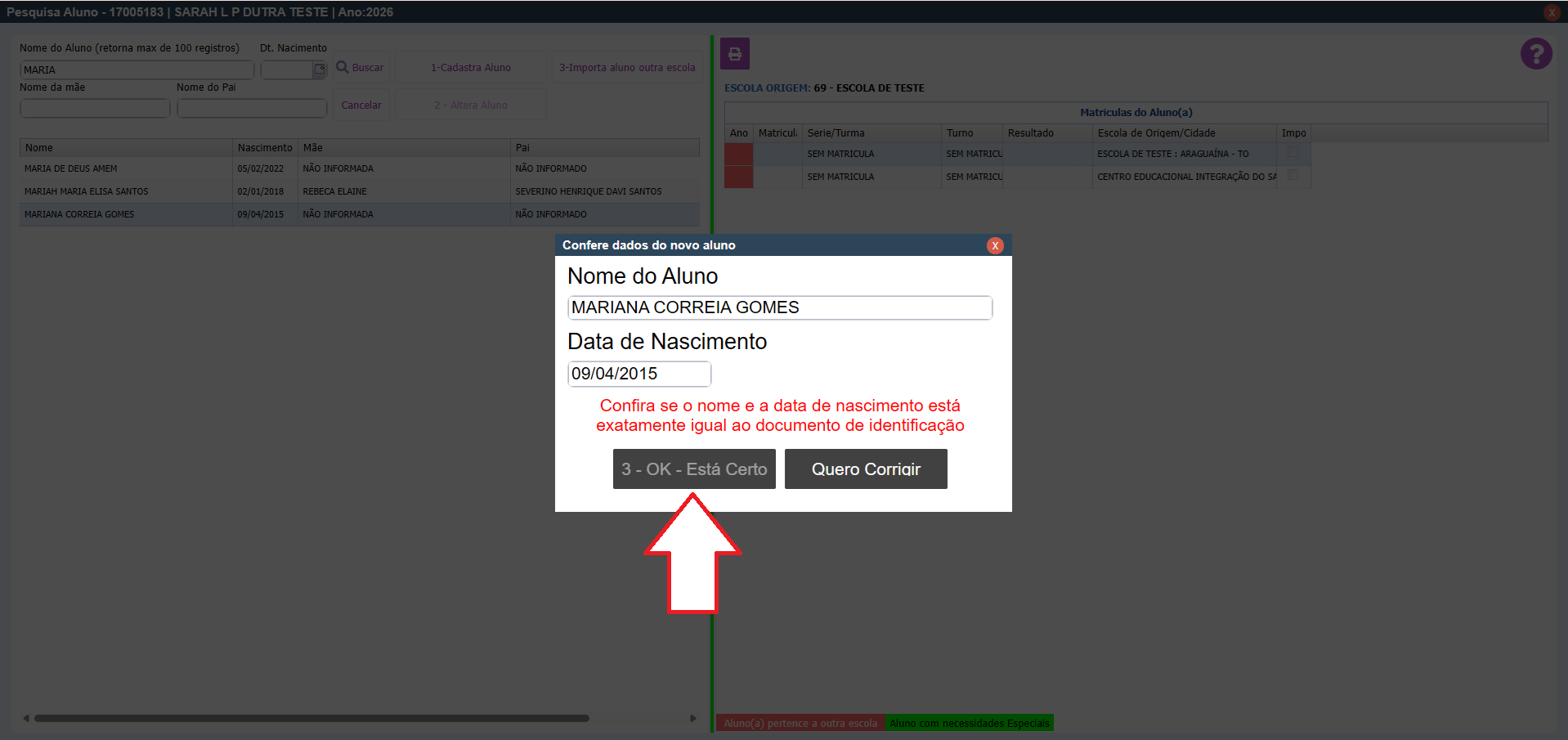 5. O sistema irá exibir essa mensagem para confirmar se é realmente esse aluno que você precisa importar. Caso seja, ao final da contagem regressiva, clique em OK - ESTÁ CERTO (botão identificado com a seta).