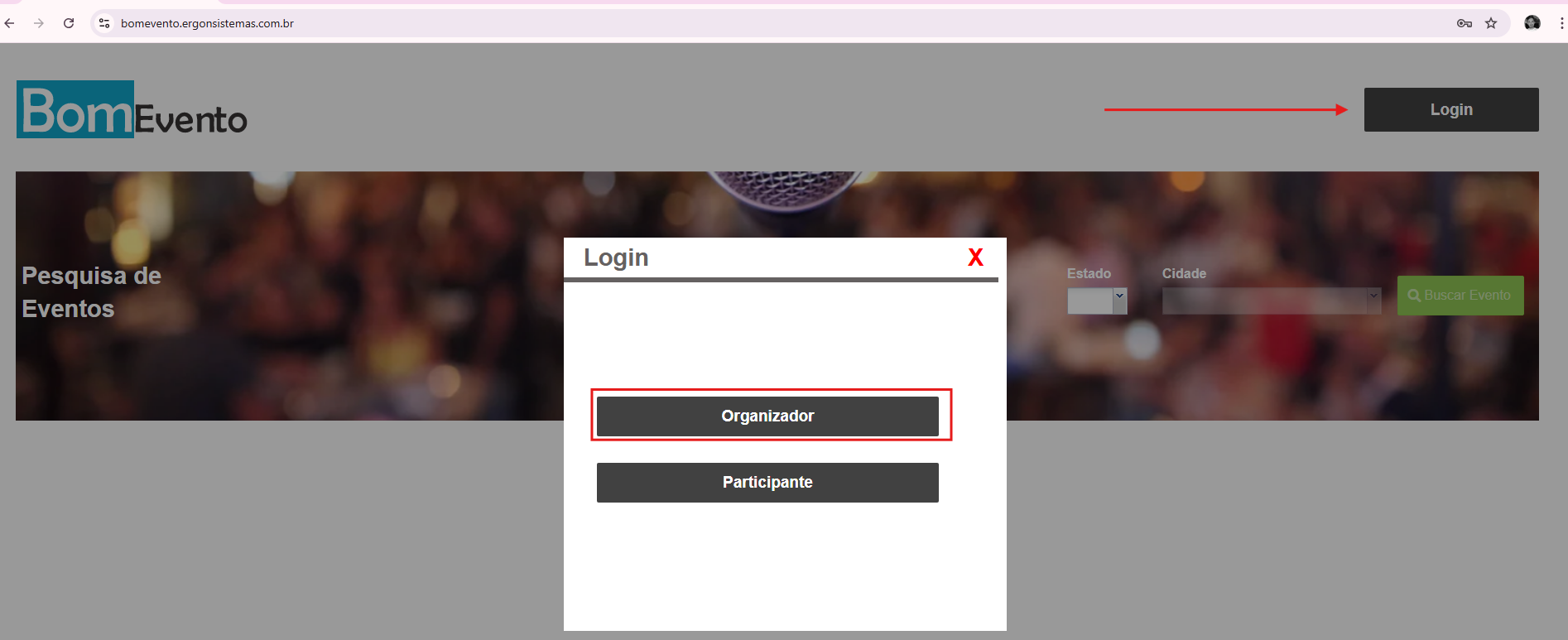 www.bomevento.ergonsistemas.com.br (bomevento.ergonsistemas.com.br in Bing) - Clique em LOGIN e escolha Acesso de Organizador