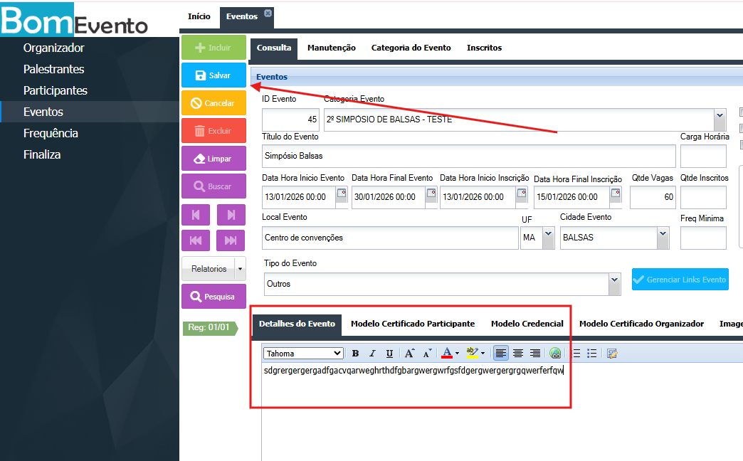 Informe os detalhes do evento, coloque as informações e clique em salvar.
