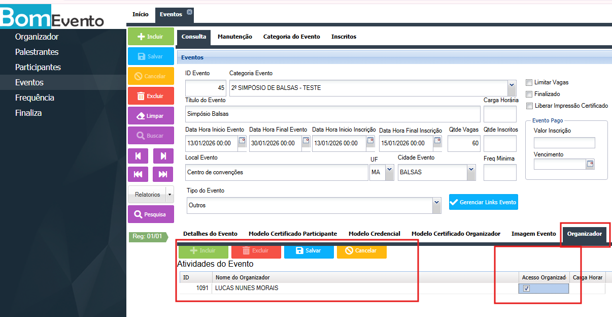 6 - Agora voce deve incluir o organizador do evento que pode ser mais de um.