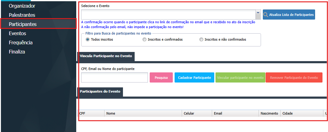 9 - Para ter acesso a parte de inscritos clique em PARTICIPANTES, selecione o evento e acompanhe as seguintes informações: