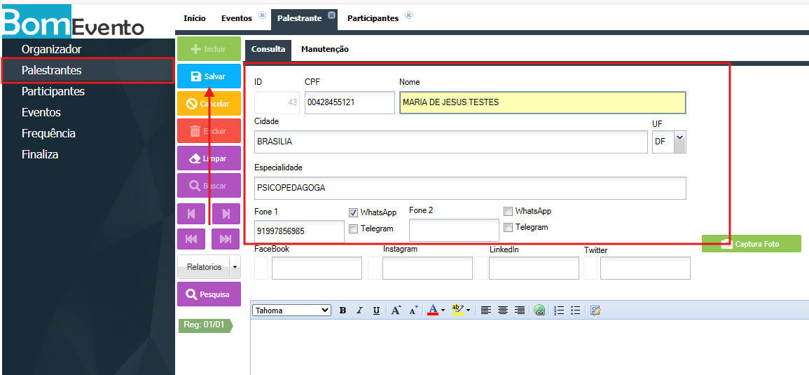 8 - O cadastro de palestrante é muito importante para um evento, assim os participantes ficam por dentro de quem irá ministrar as capacitações. Clique na opção PALESTRANTE e realize a inserção dos dados solicitados clicando em NOVO e depois SALVAR.