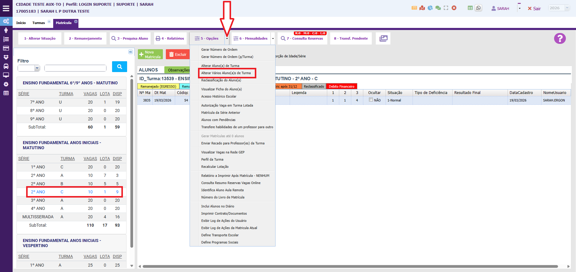 1. Na tela de matrículas, selecione a turma para onde os alunos serão movidos e clique no botão 5- opções e selecione a opção ALTERAR VÁRIOS ALUNOS DE TURMA.