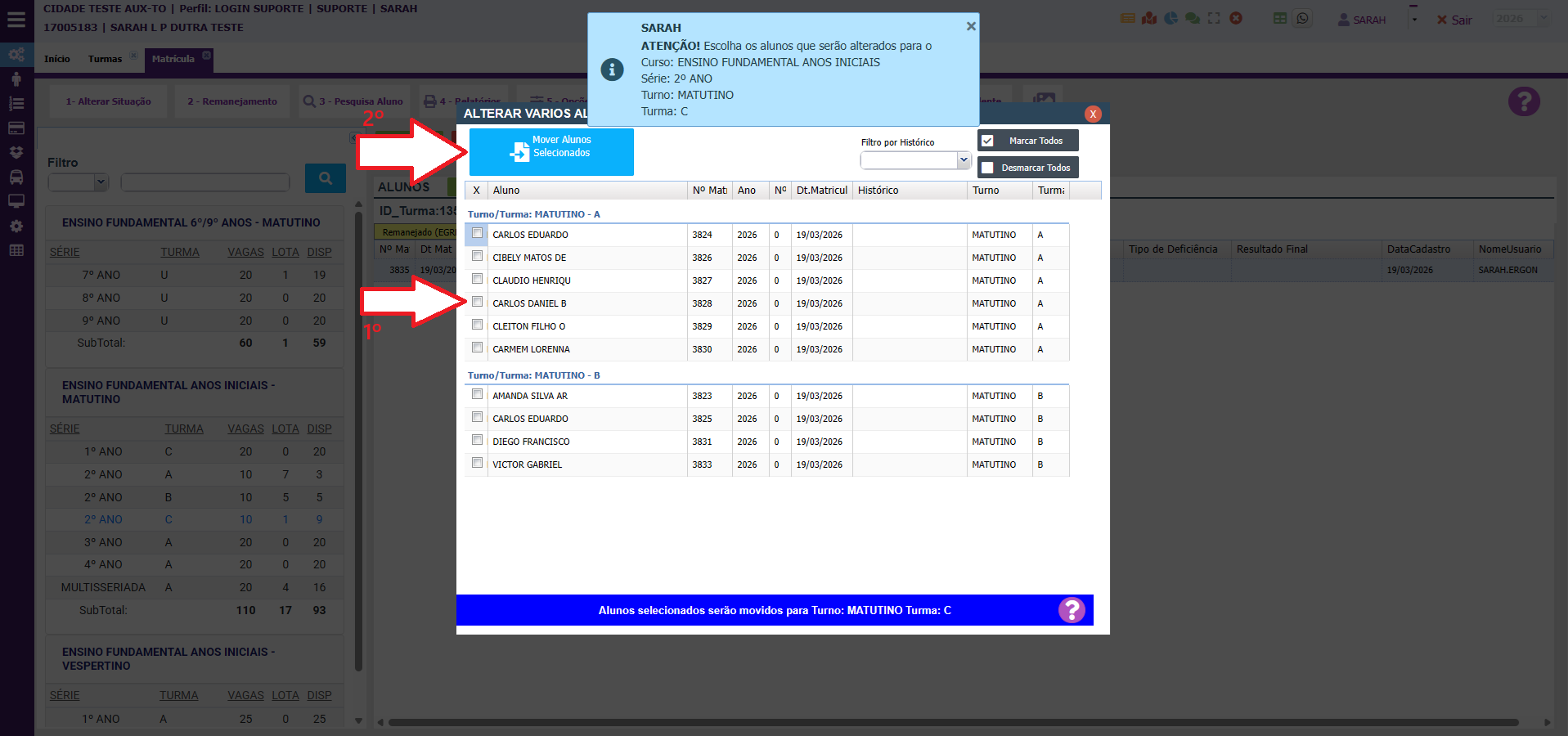 2. Selecione marcando a caixinha ao lado dos alunos que irão para a outra turma e confirme a mensagem.