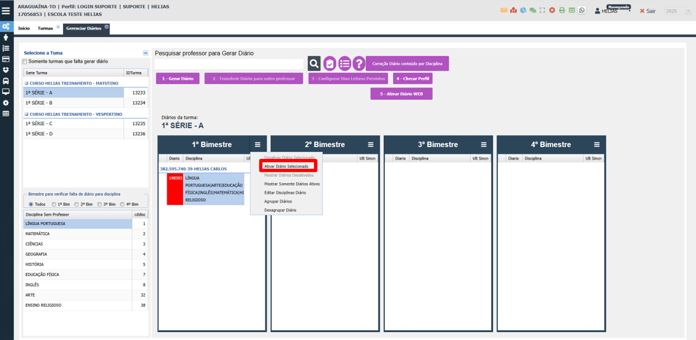 6. Quando desativar de todos os bimestres, note que as disciplinas que fazia parte vão voltar para a seleção de gerar diário.