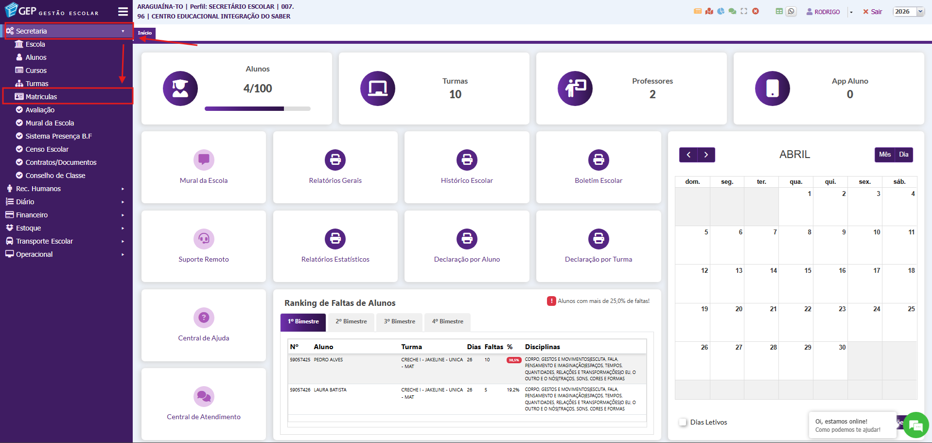1. Acesse o menu lateral SECRETARIA e clique no módulo MATRÍCULAS: