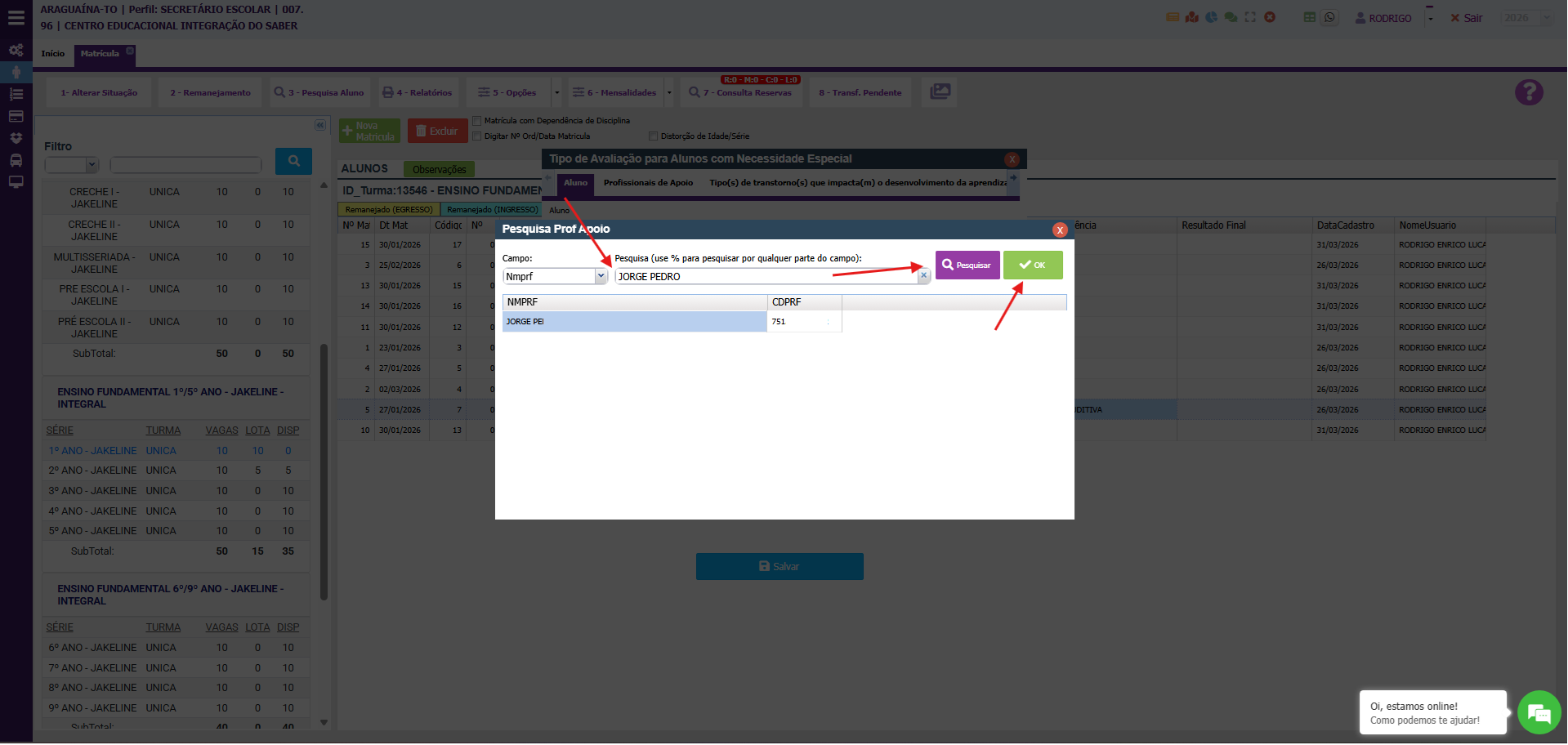 4. Na janela que abrir, verifique e confirme o nome do aluno e na clique na lupa para pesquisar o profissional a inserir, conforme a imagem: