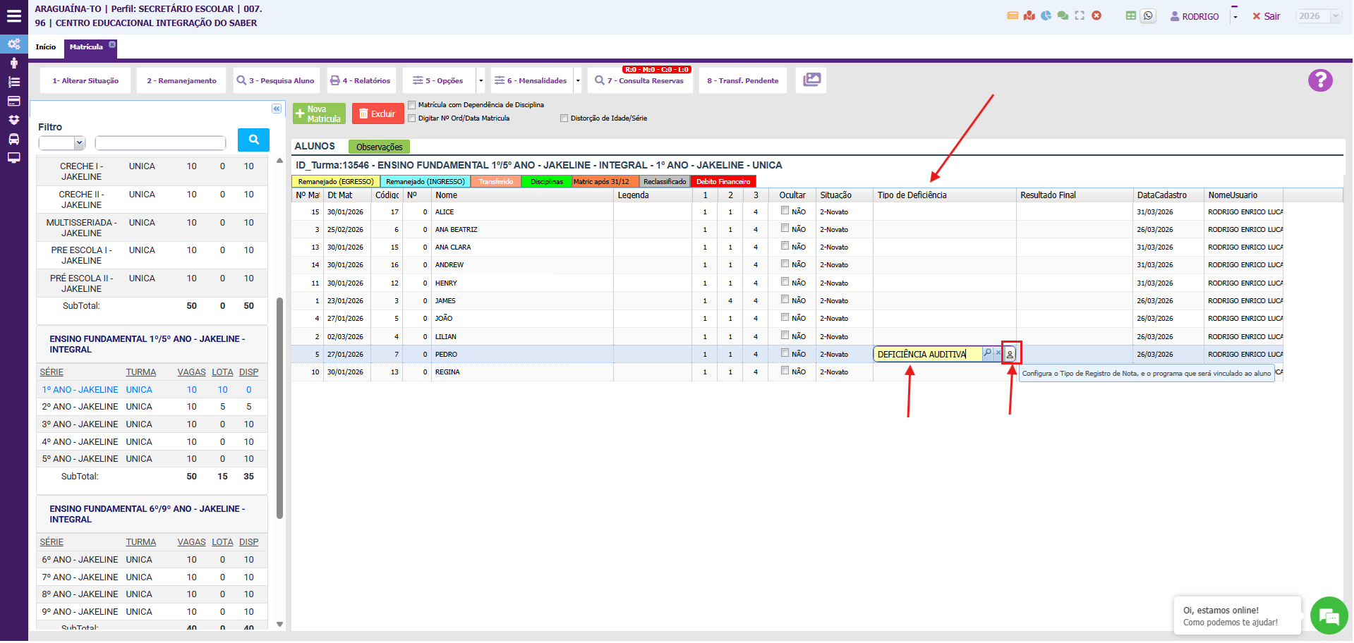 3. Após selecionar o cadastro do aluno, clique na informação preenchida na coluna TIPO DEFICIÊNCIA, em seguida, no ícone de