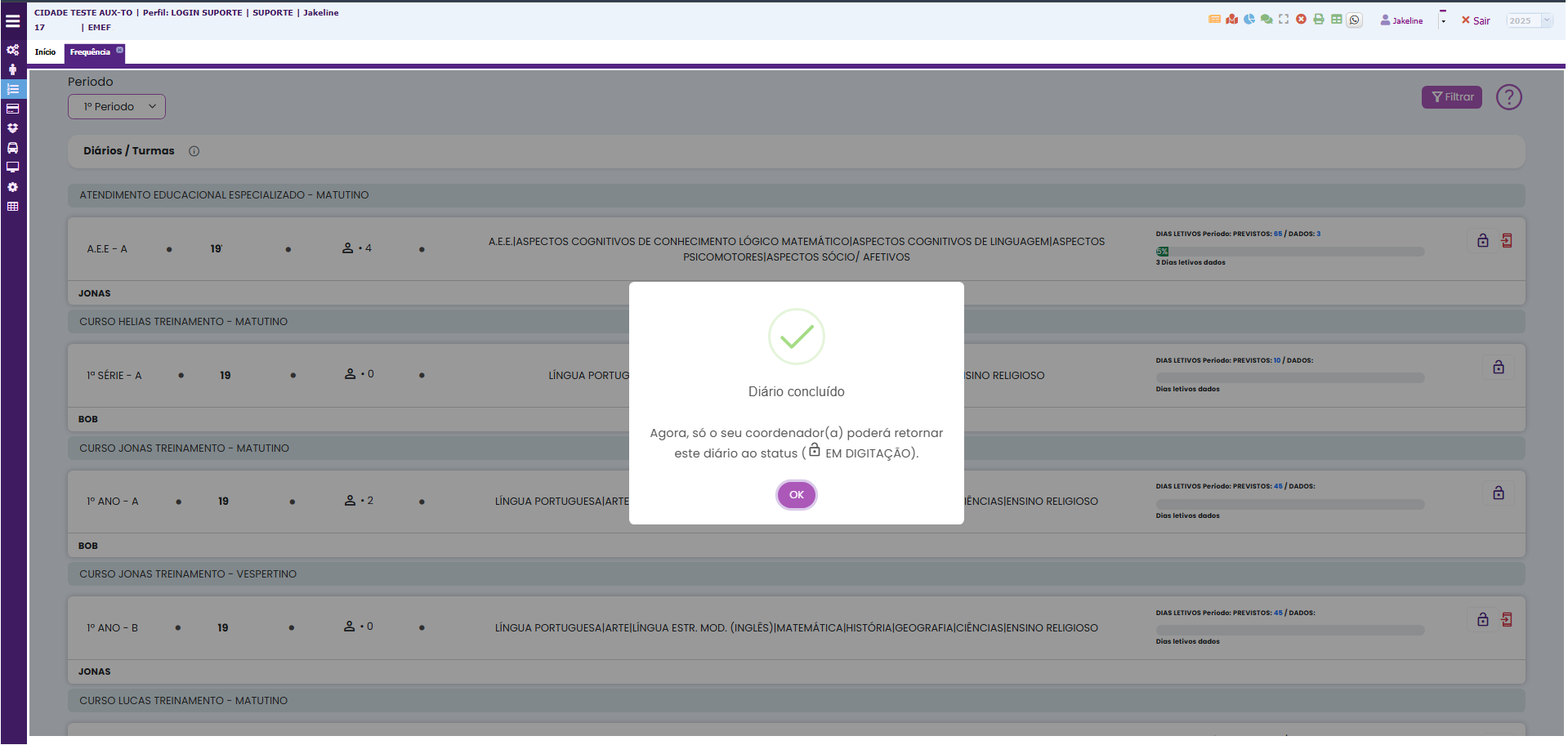 - Ao colocar o diário como "Concluído", somente a coordenação pedagógica poderá realizar a troca da informação, liberando o diário novamente para o professor.