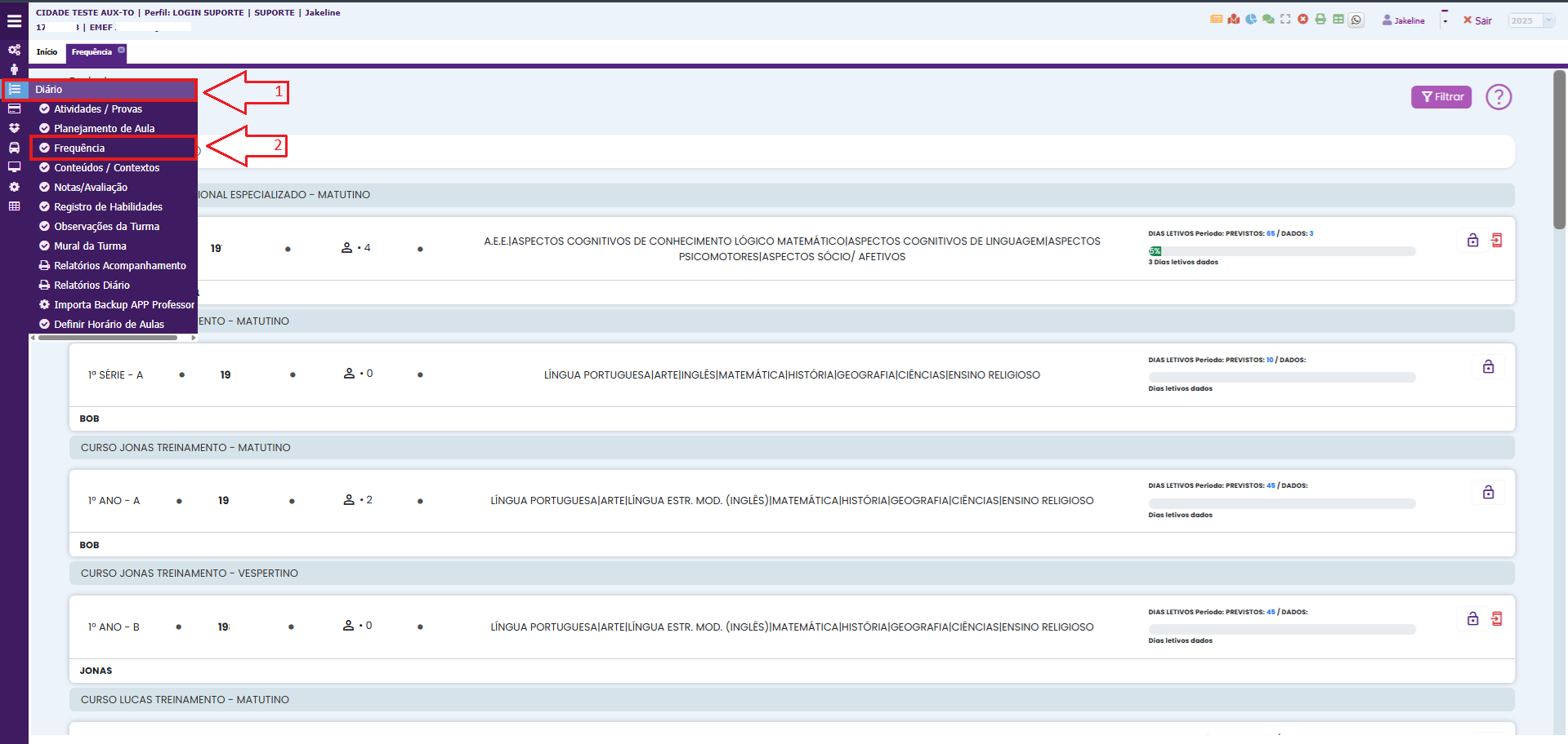 1. Vamos ao tutorial, primeiramente no menu Diário selecione a opção Frequência: